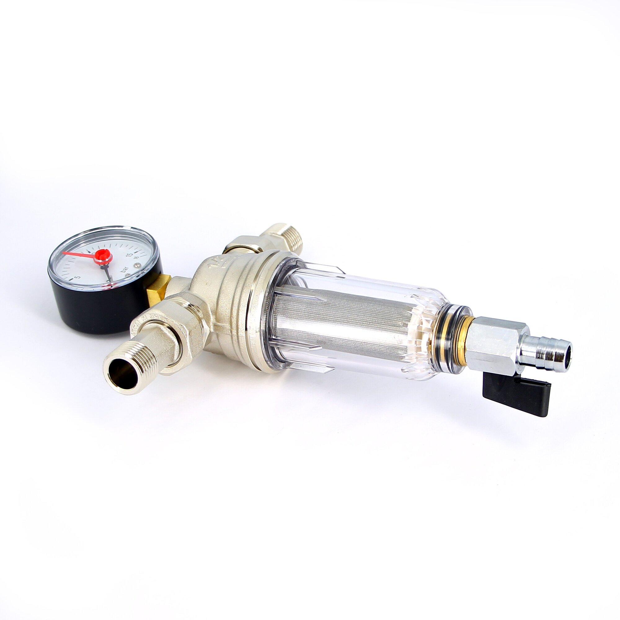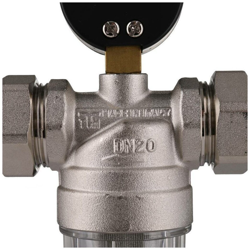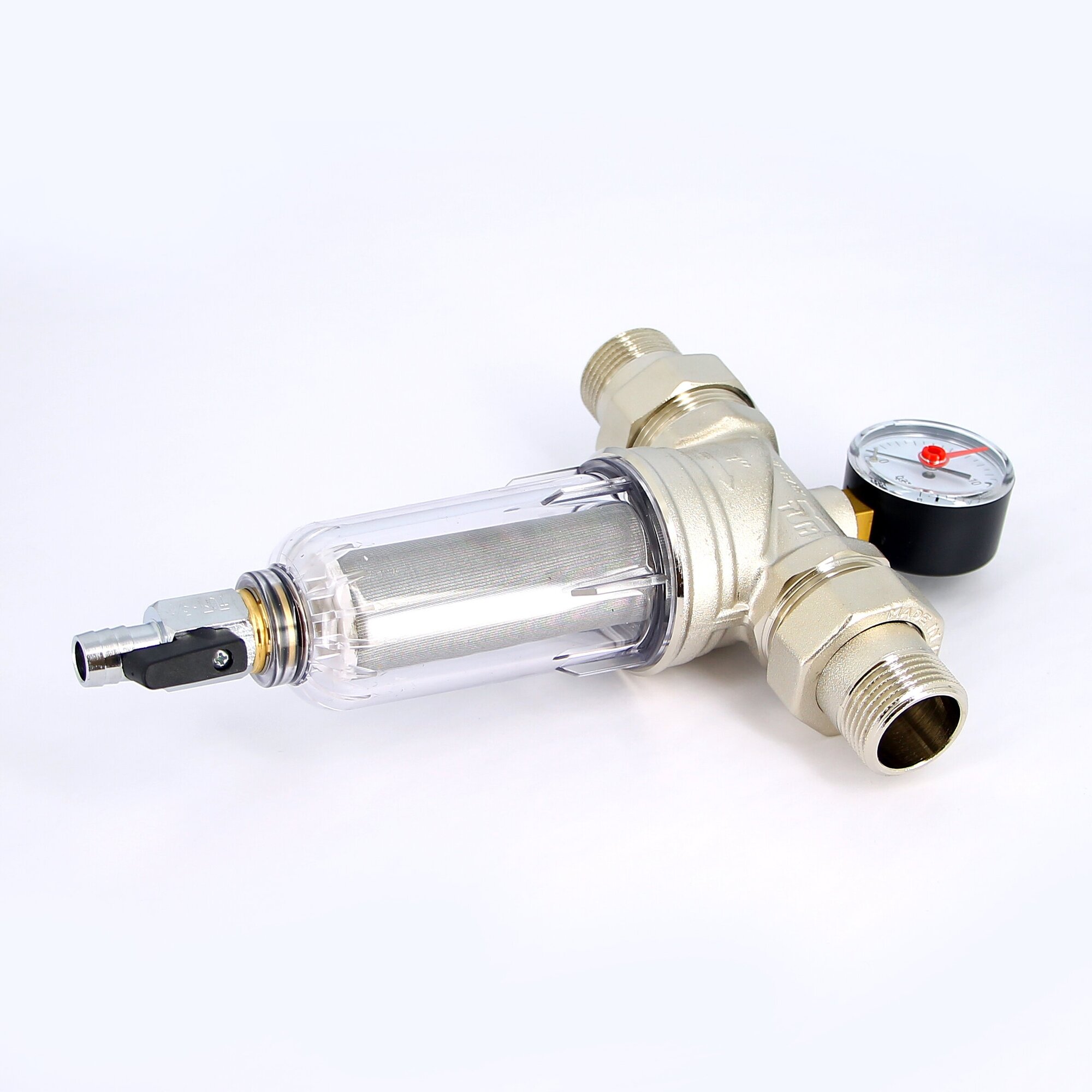 Body material: brass, connection type: socket BP/BP, nominal pressure: PN 16, cell size: 100 microns, options: pressure gauge, drain