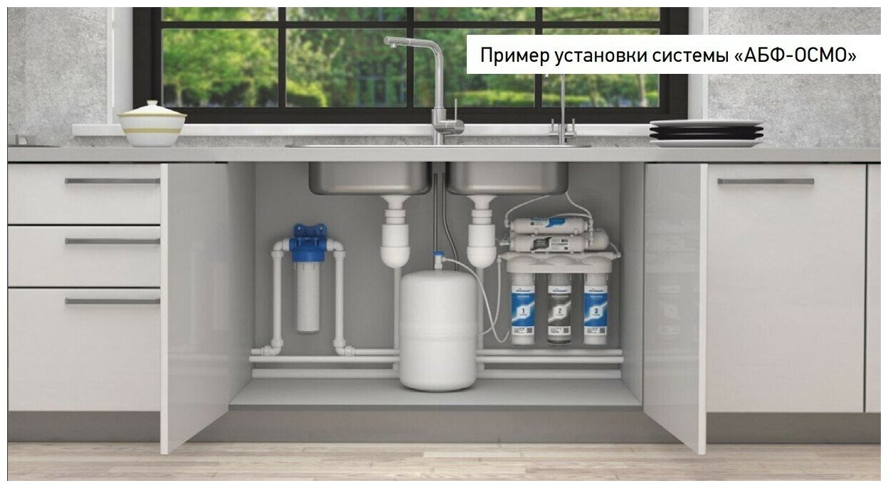 Included: filter with cartridges, reverse osmosis membrane, post-filter, mineralizer, storage tank, kitchen sink faucet, tube, key, water connection, instructions and warranty card