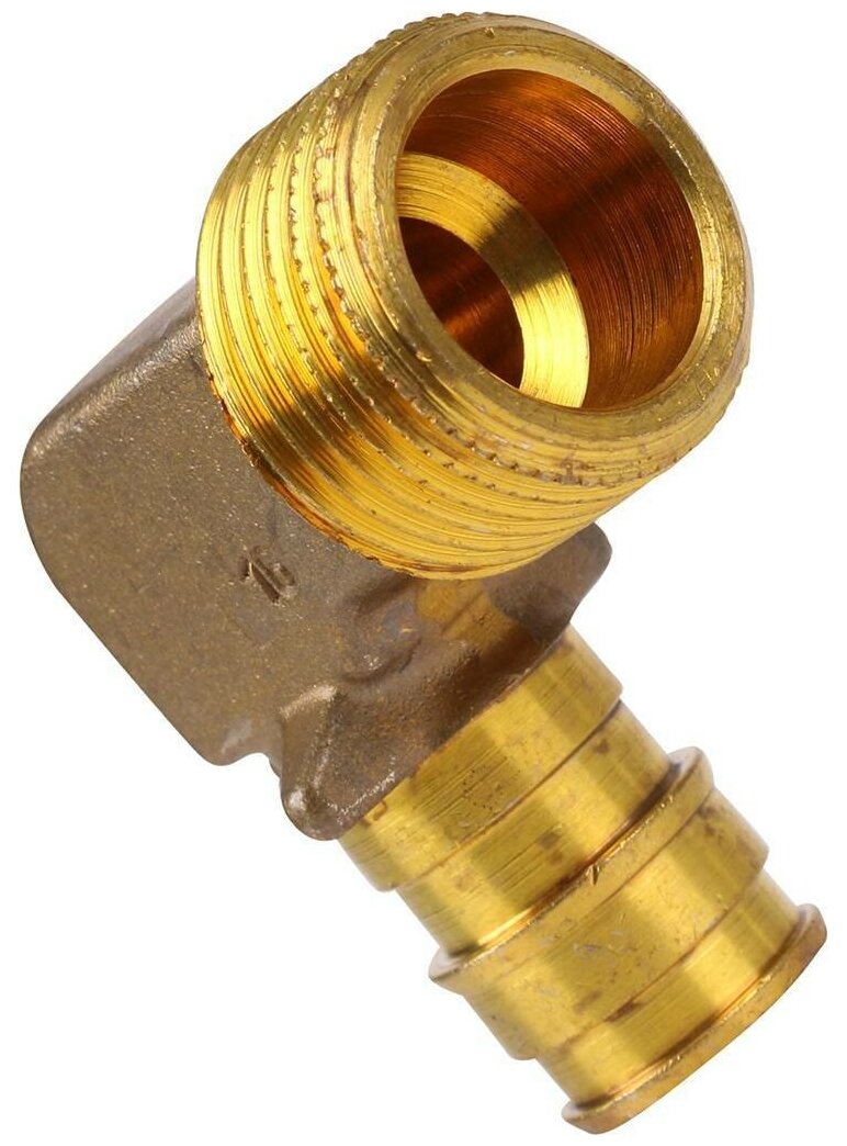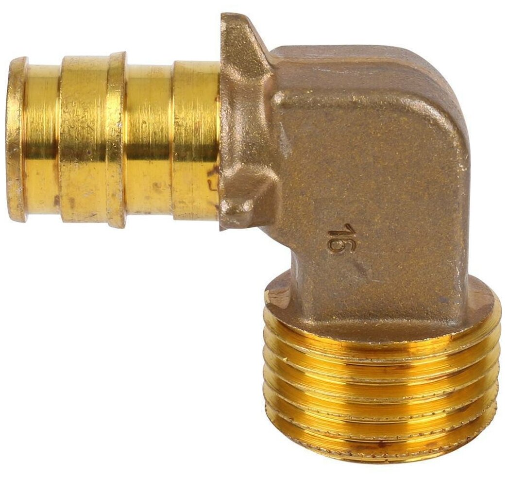 Type: elbow 90°, connection type: axial - thread, connection: male, thread diameter: ½", pipe diameter: 16 mm, material: brass, with fastening, combined