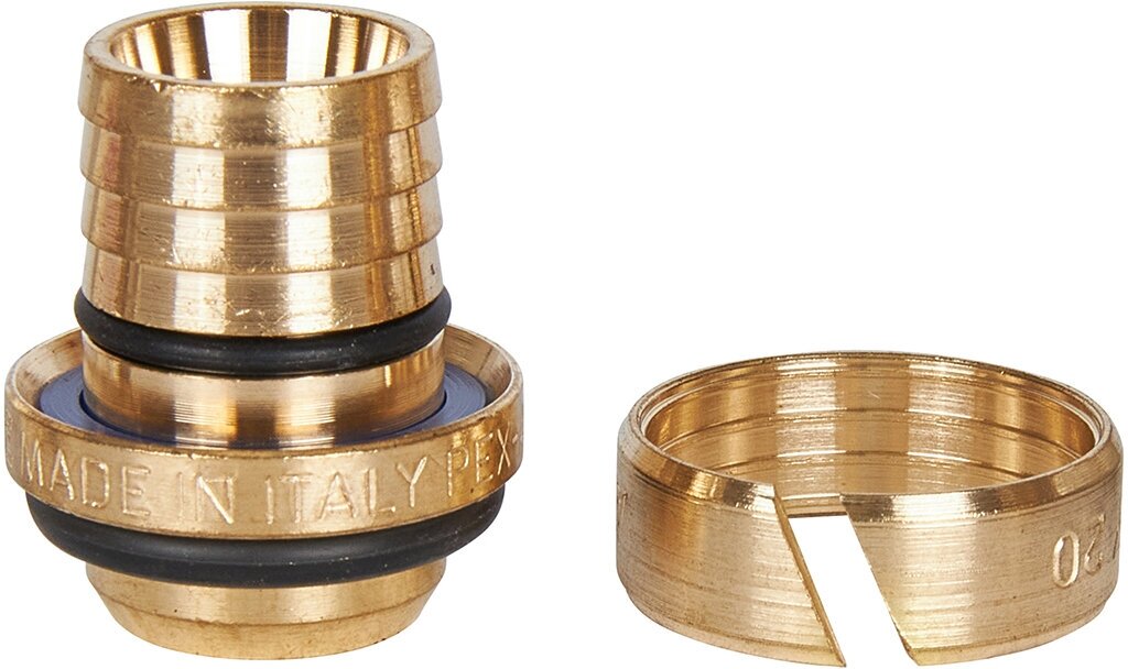 Type: 90° elbow, connection type: collet crimp, connection: Crimp, thread diameter: 1", pipe diameter: 20 mm, material: brass, split, with union nut, with seal