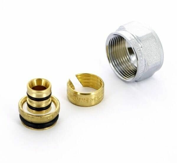 Type: tee, connection type: press-crimp, connection: female, press fitting profile: TH, thread diameter: M20, pipe diameter: 15 mm, 20 mm, material: nickel-plated brass, detachable, with union nut, with seal, combo