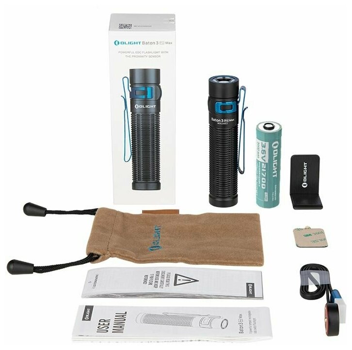 Power supply: 1 x CR123A / 1 x RCR123 / 1 x Li-ion 16340, memory function, storage bag, magnet, timer; battery type: ICR21700; Detailed content: Olight Baton 3 Pro Max, Olight carrying pouch, Olight MMC3 magnetic USB charger, mount