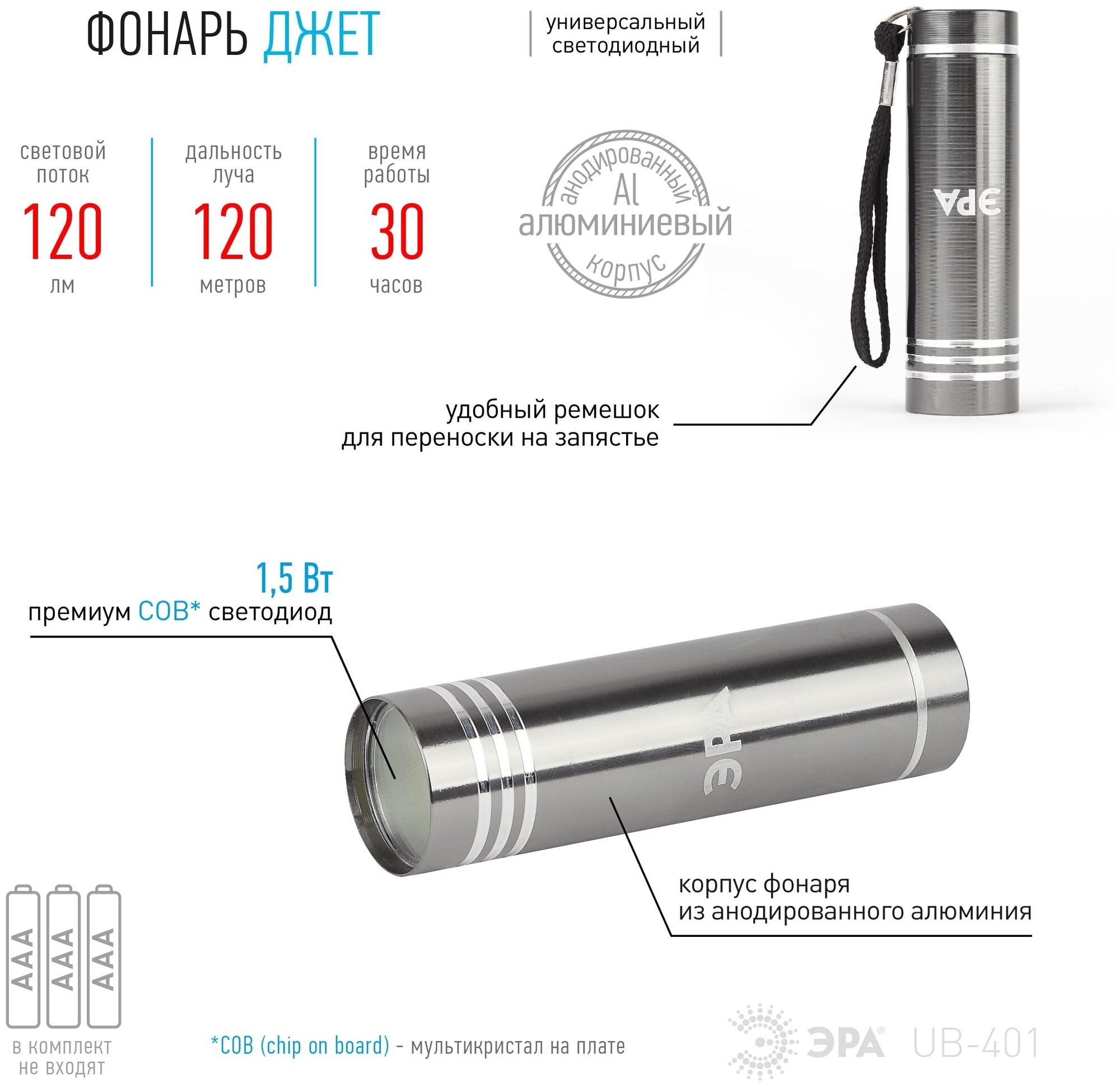 Flashlight universal ERA UB-401 Jet 1.5W COB 3xAAA aluminum metallic; battery type: AAA; detailed equipment: Flashlight universal ERA UB-401 Jet 1.5W COB 3xAAA aluminum metallic; number of batteries: 3; number of operating modes: 1