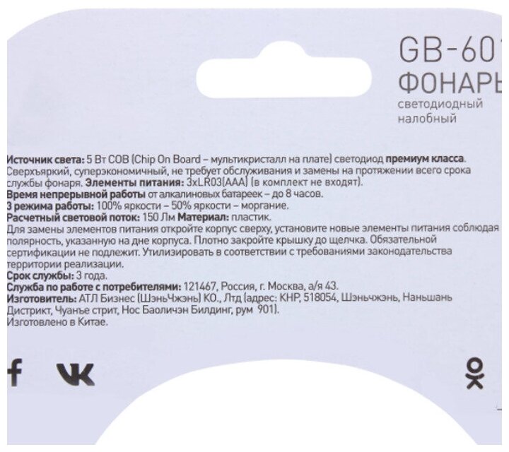 Power, W: 5; battery type: AAA; number of batteries: 3; number of operating modes: 3