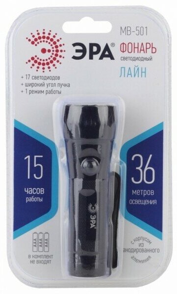 Type: hand torch, light source: LEDs, power supply: batteries, luminous flux: 105 lm, lighting range: 36 m, maximum operating time: 15 h, housing material: aluminum