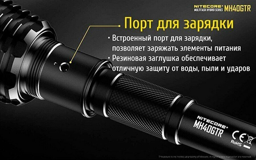 Power supply: 4xRCR123 RCR123 or 2x18650; battery type: ICR18650; detailed equipment: Nitecore MH40GTR flashlight, Nitecore branded case, NL183 18650 2600mAh battery - 2 pcs., 12V adapter for 220V network, tactical ring, clip, hand strap, lanyard, force