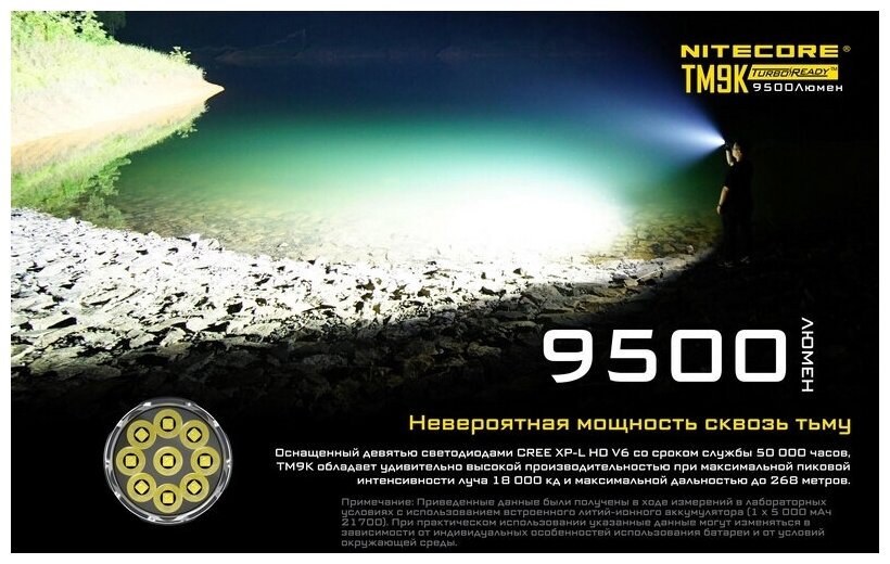 Type: hand torch, light source: LEDs, features: stroboscope, impact-resistant housing, luminous flux: 9500 lm, lighting range: 268 m, body material: aluminum, weight: 218 g