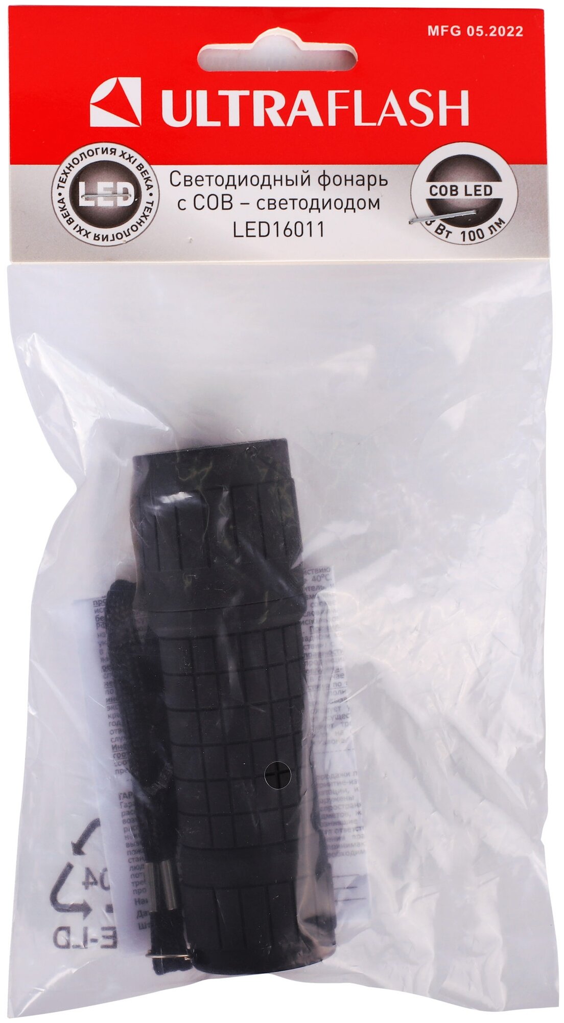 Power 3 watts; color temperature 6500 K; battery type: AAA; detailed equipment: flashlight, carrying strap, instructions, blister package; number of batteries: 3