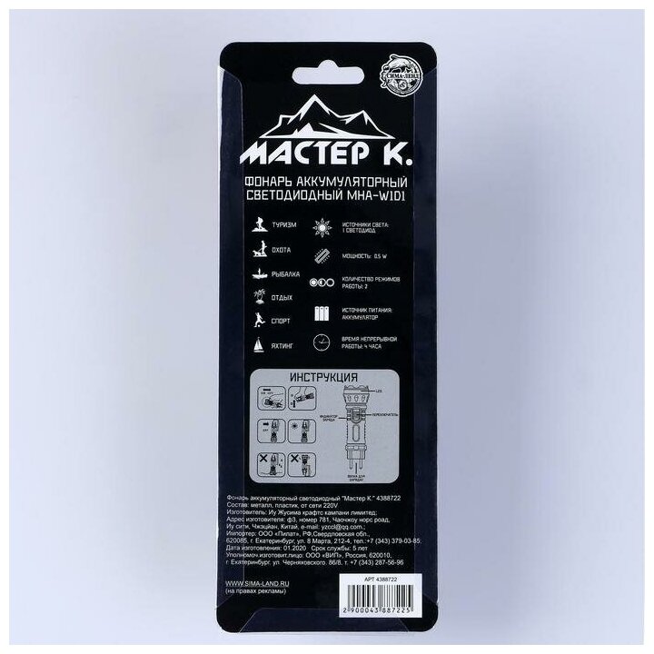 Type: hand lamp, light source: LEDs, power type: built-in battery, power consumption: from the mains, features: charge indication, maximum operating time: 4 h, case material: plastic, weight: 90 g