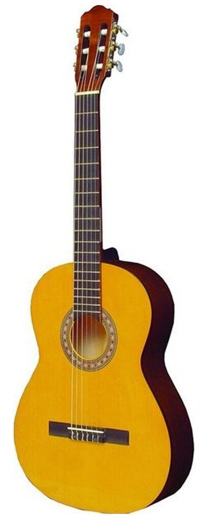 Type: classical guitar, number of frets: 18, number of strings: 6, body material: laminate, neck material: maple, color: black