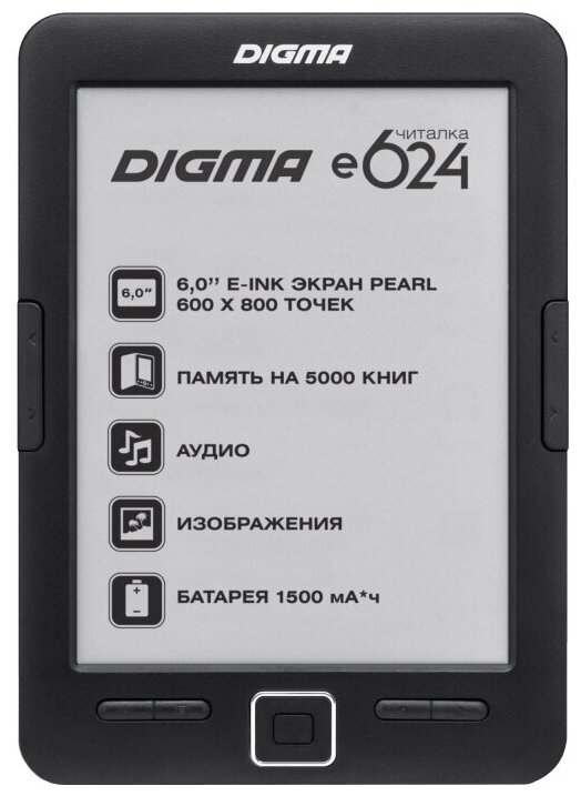 Display type: E-Ink, diagonal: 6", E-Ink display generation: Pearl, design features: paging buttons, book and document formats: CHM, DJVU, DOC, EPub, FB2, HTML, PDF, PalmDOC, RTF, TXT , XLS, display resolution: 800x600