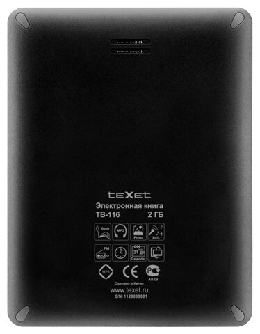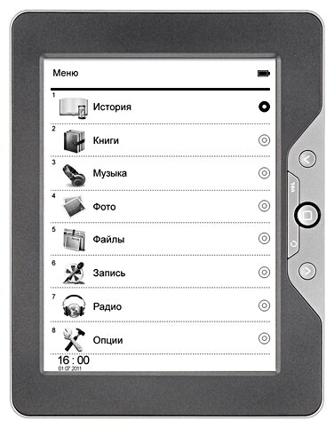 Speaker; support for WMA, FLAC, OGG, WAV, APE formats; USB interface: yes; Charging from the network: yes; Format support: WTXT, MOBI, HTM