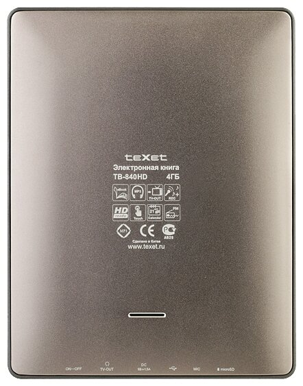 Display type: LCD color, diagonal: more than 7", design features: built-in backlight, paging buttons, touch screen, book and document formats: DJVU, EPub, FB2, HTML, PDF, PalmDOC, RTF, TXT, display resolution: 800x600