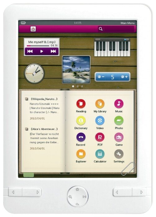 Display type: LCD color, diagonal: 7", design features: built-in backlight, paging buttons, touch screen, book and document formats: EPub, FB2, HTML, PDF, PalmDOC, TXT, display resolution: 800x600