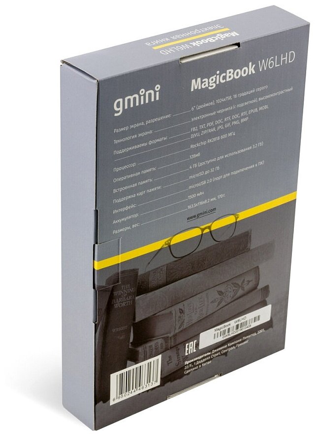 Display type: E-Ink, diagonal: 6", E-Ink display generation: Pearl HD, design features: built-in backlight, paging buttons, book and document formats: CHM, DJVU, DOC, EPub, FB2, HTML, PDF, PalmDOC , RTF, TXT, XLS, display resolution: 1024x758