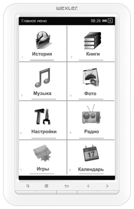 Display type: E-Ink, diagonal: 7", E-Ink display generation: Vizplex, design features: paging buttons, touch screen, book and document formats: CHM, DJVU, DOC, EPub, FB2, HTML, PDF, RTF, TXT, display resolution: 1024x600