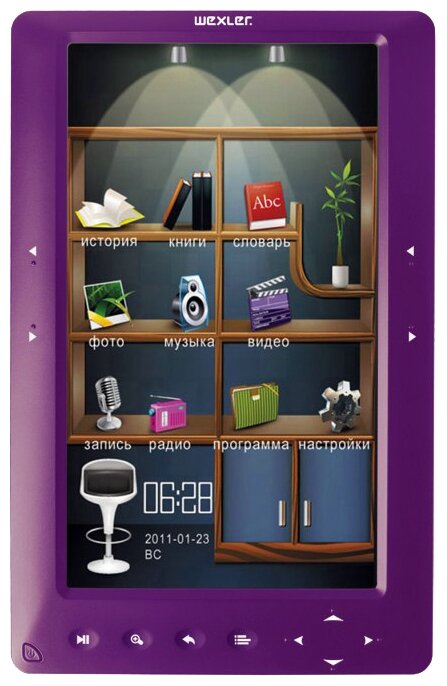 Display type: color LCD, diagonal: 7", design features: built-in backlight, book and document formats: DOC, EPub, FB2, HTML, PDF, PalmDOC, RTF, TXT, display resolution: 800x480