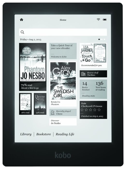 Display type: E-Ink, diagonal: 7", E-Ink display generation: Pearl, design features: built-in backlight, touch screen, wireless connection: Wi-Fi, book and document formats: EPub, HTML, PDF, RTF, TXT , display resolution: 1440x1080