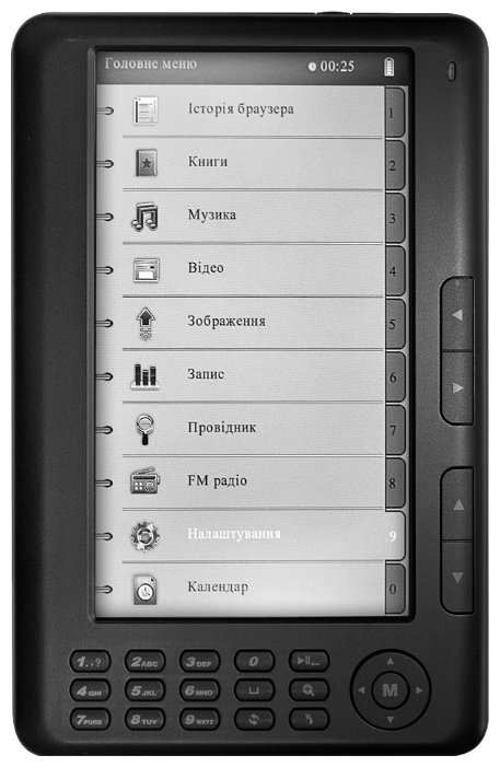 Display type: color LCD, diagonal: 7, design features: built-in backlight, book and document formats: EPub, FB2, HTML, PDF, PalmDOC, RTF, TXT, display resolution: 800x480