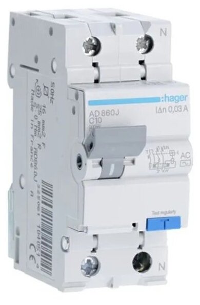 Differential circuit breaker Hager 1PN 4.5kA C-10A 30mA ACAD860J
