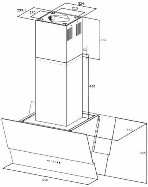 Form factor: inclined, width: 90 cm, depth: 55 cm, operating modes: exhaust / circulation, installation location: island ceiling, filter: Carbon, control type: Touch, lighting type: LED, maximum level