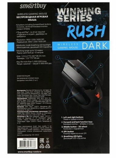 RUSH Dark, gaming, wireless, 1600 dpi, 2xAAA, USB, backlight, black