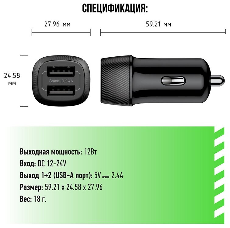 Cable connector: USB Type-A, number of connectors: 2, maximum output current: 2.40 A, maximum output power: 12 W