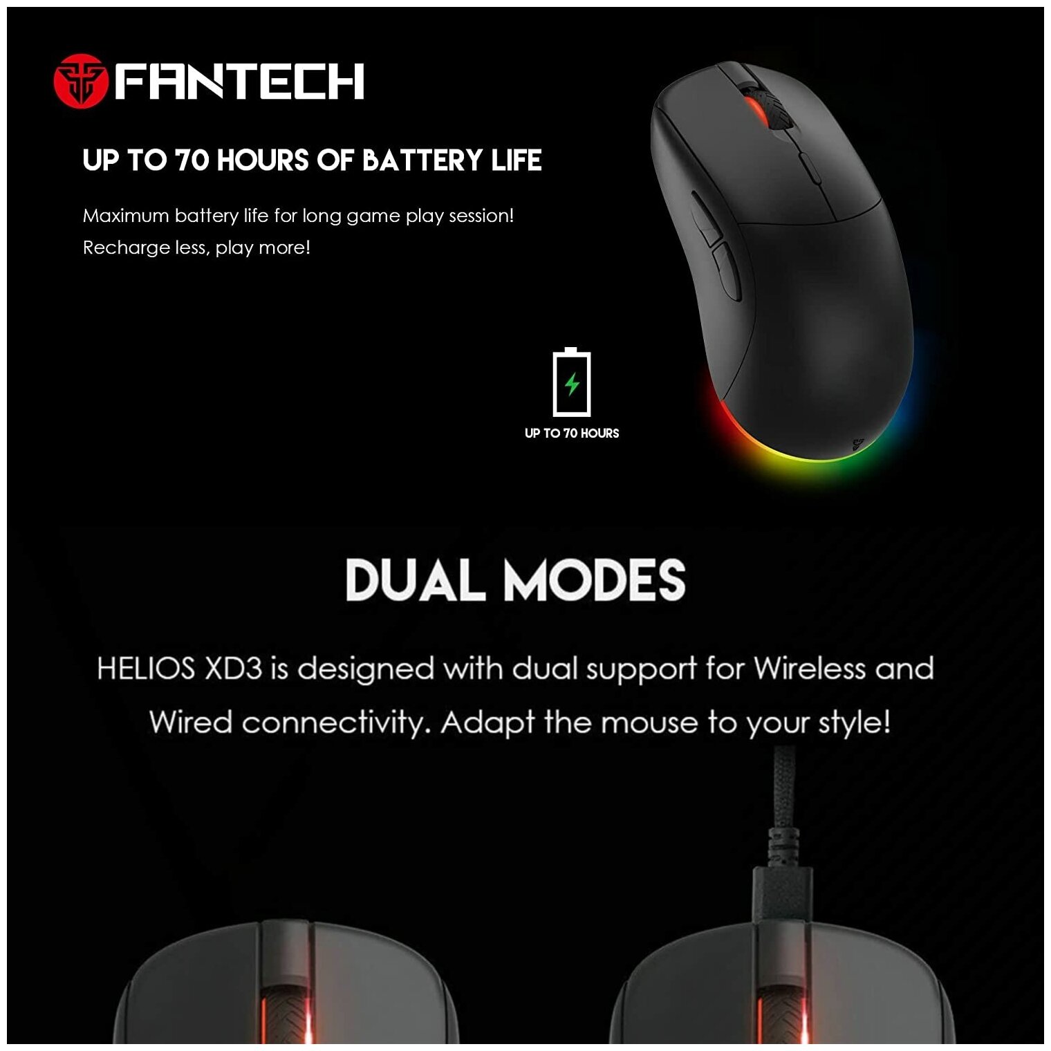 HELIOS XD3v2 mouse, USB receiver, USB adapter, additional PTFE feet, USB type C charging cable, manual.