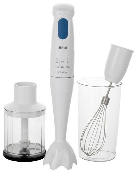 Type: submersible, maximum power: 300 W, material of the submersible part: plastic, attachments: whisk, chopper, set includes: measuring cup, chopper capacity: 0.35 l, number of speeds: 1, con