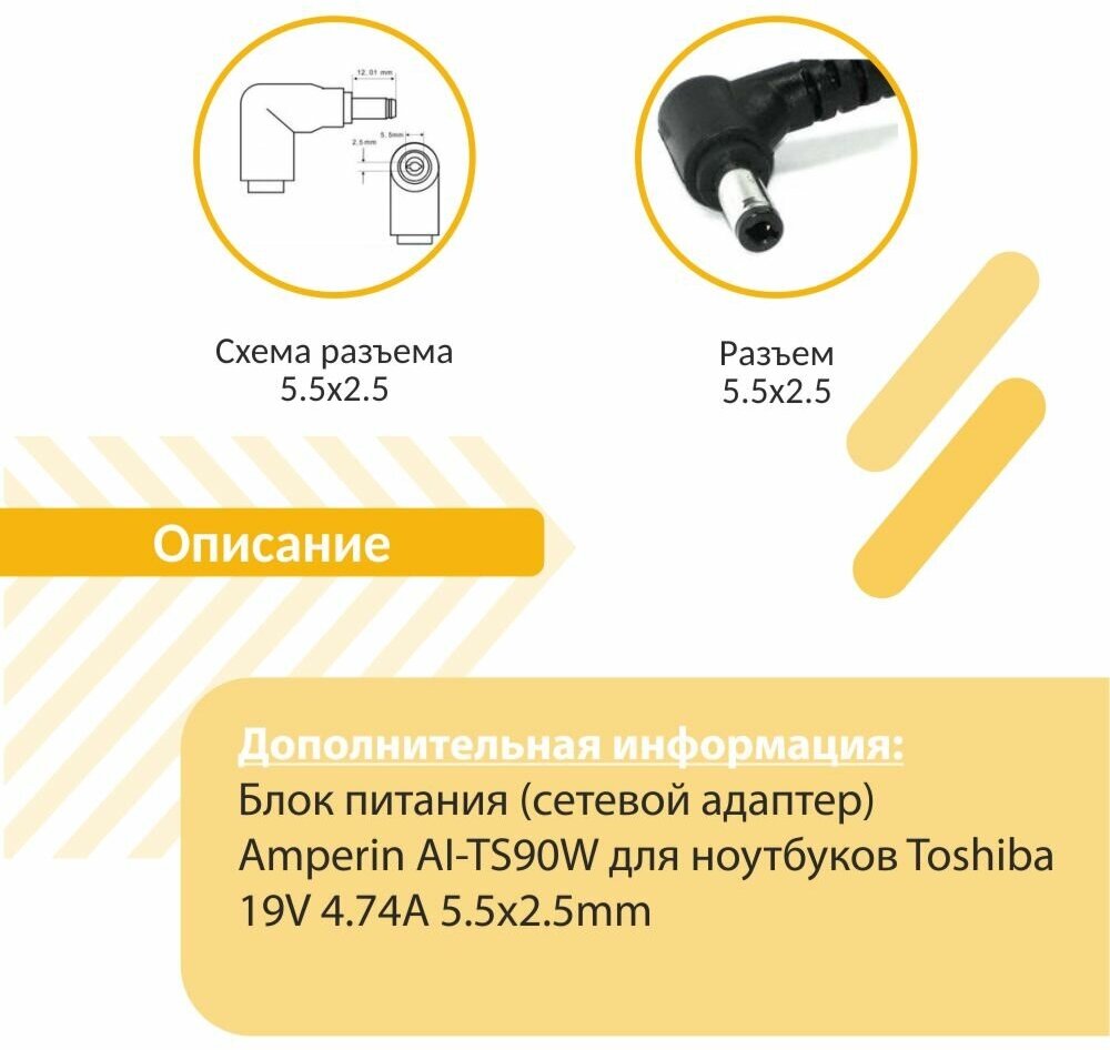 Type: for laptop, connectors: 5.5 x 2.5 mm, output voltage: 19 V, power: 90 W, max. current strength: 4.74 A
