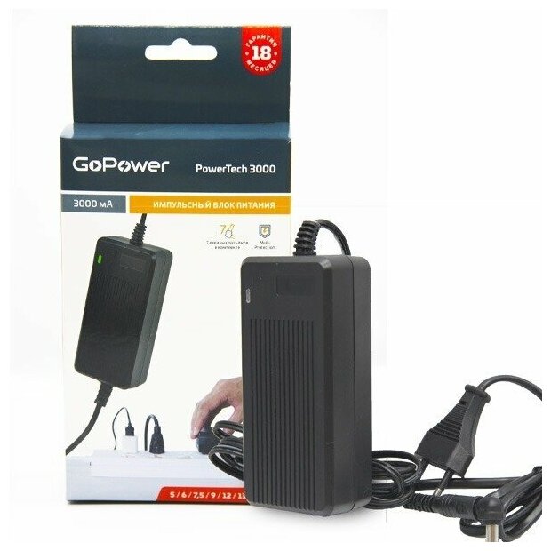 Type: power supply, compatibility: universal, connectors: 5.5 x 2.5, max. current: 3A, features: short circuit protection, overload protection, overvoltage protection