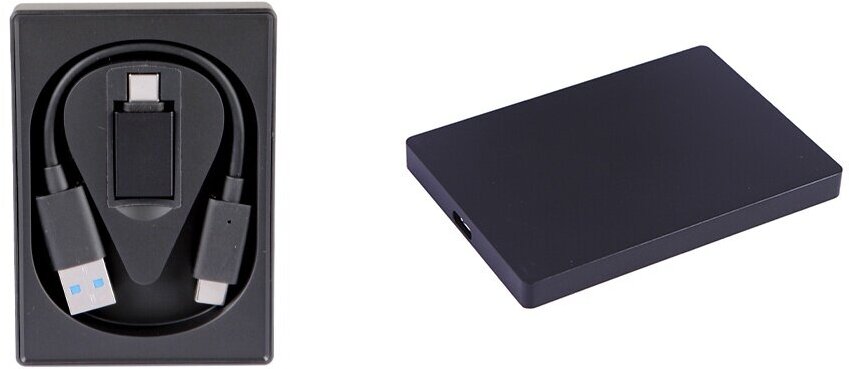 External SSD, USB Type-A to USB Type-C adapter, USB Type-C to USB Type-A cable, documentation