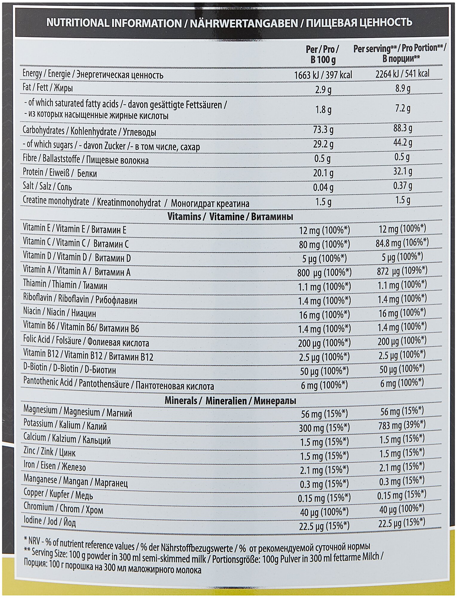 Additional Information: 100 g of powder 2 level scoops mixed with 300 ml of water; Serving Size: 100 g; serving calorie content: 400 kcal; saturated fat: 1.8 g; energy value per 100 g: proteins - 19.2 g; carbohydrates - 71.6 g; fats - 0.4 g; recommendations for taking