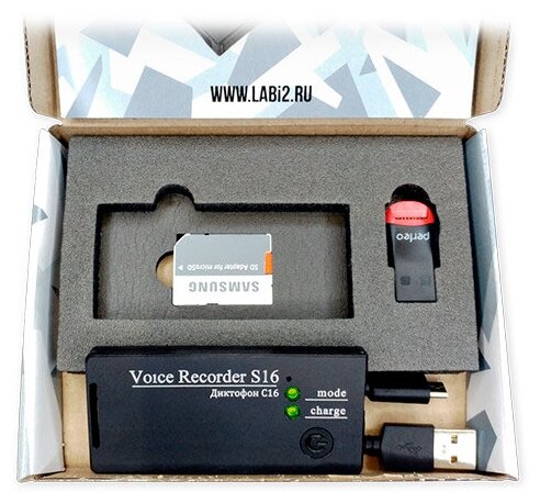 WAV memory format; the kit includes: USB cable for charging the voice recorder, SDHC 32 GB memory card, card reader, external microphone 1 m, CD with software