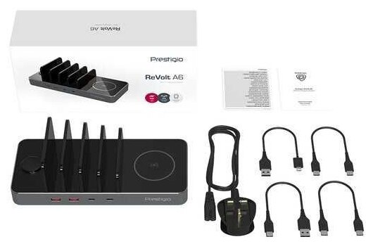 Power supply with built-in cable, 2 Type-C - Type-C cables, 2 Type-C - USB-A cables, wireless charging base, documentation