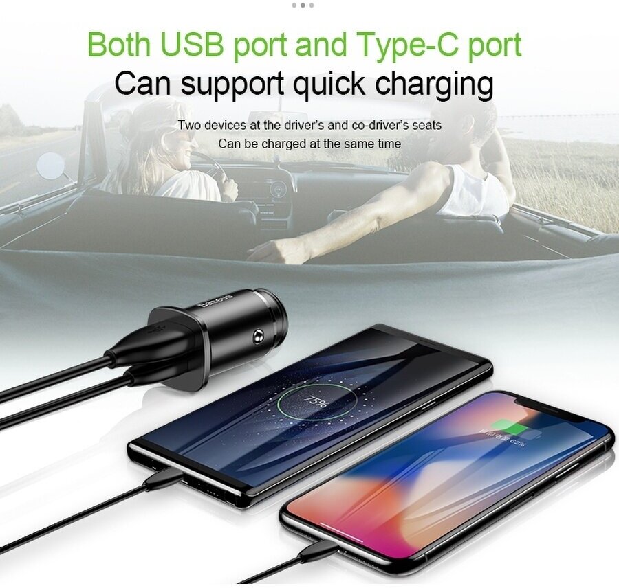 Car charger BASEUS Square metal, USB+USB-C, 5A, 30 W, black, fast charging
