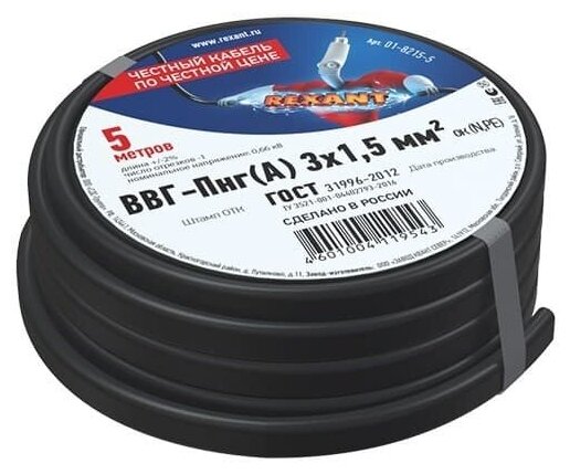 VVG-PngA 3x1.5 mm², length 5 meters, GOST Rexant